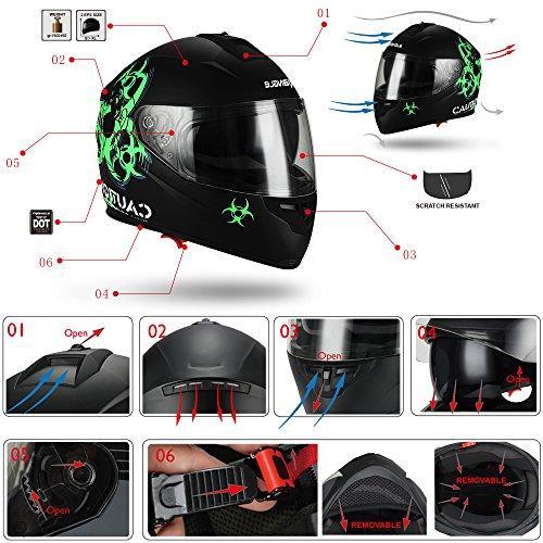 Full Face Helmet. DOT Approved. Advanced ABS shell with high pressure thermoplastic technology. Multi Density EPS liner. Ventilation system with top and rear extractors liner. Double PC anti-scratch visor and removable DVS treatment with quick change mechanism system.