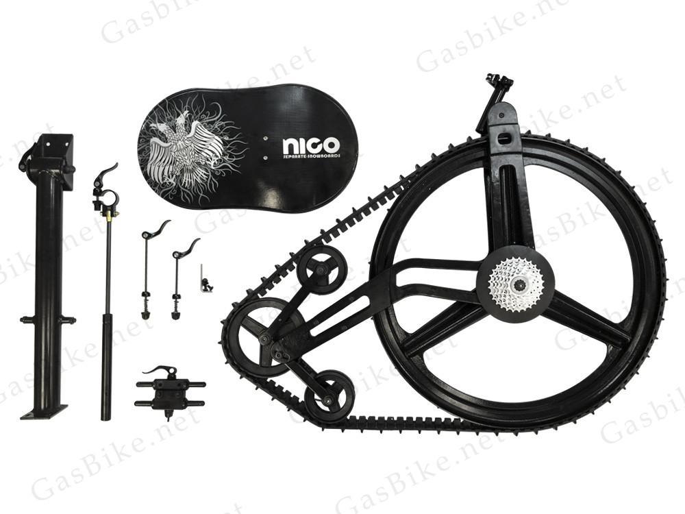 The rear drive track kit comes in 26 inch. wheel sizes, takes about as long to install as changing a tire, and adds grip on sand and snow. The front ski (top right) is optional, but fun. Gas Bike's traction boosting Rear Drive Kit, which consists of a Aluminum wheel with a polyurethane track, is the first step in turning your mountain bike into a muscle powered snowmobile. To complete the transformation, the Ski Kit swaps the front wheel with a single, steerable ski. The kits work with nearly any mountain bike. The rear drive track kit comes in 26 inch. wheel sizes, takes about as long to install as changing a tire, and adds grip on sand and snow. The front ski (top right) is optional, but fun.